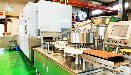 采用超聲波清洗及水氣交替沖洗、熱風循環(huán)式高溫滅菌、多頭灌裝與封口等技術。整線聯(lián)動自動控制。操作簡單方便,實現(xiàn)了機電一體化。